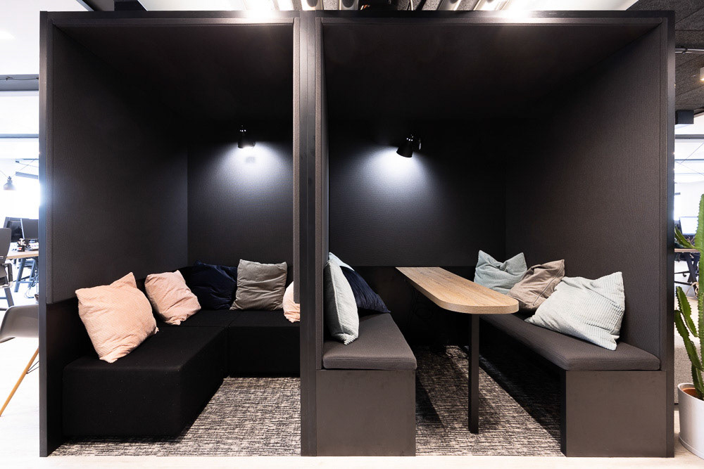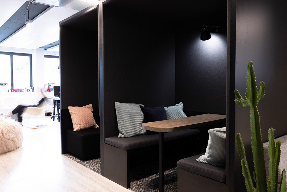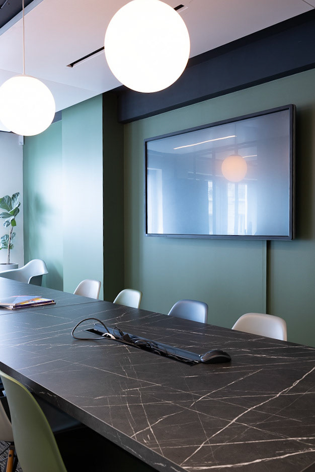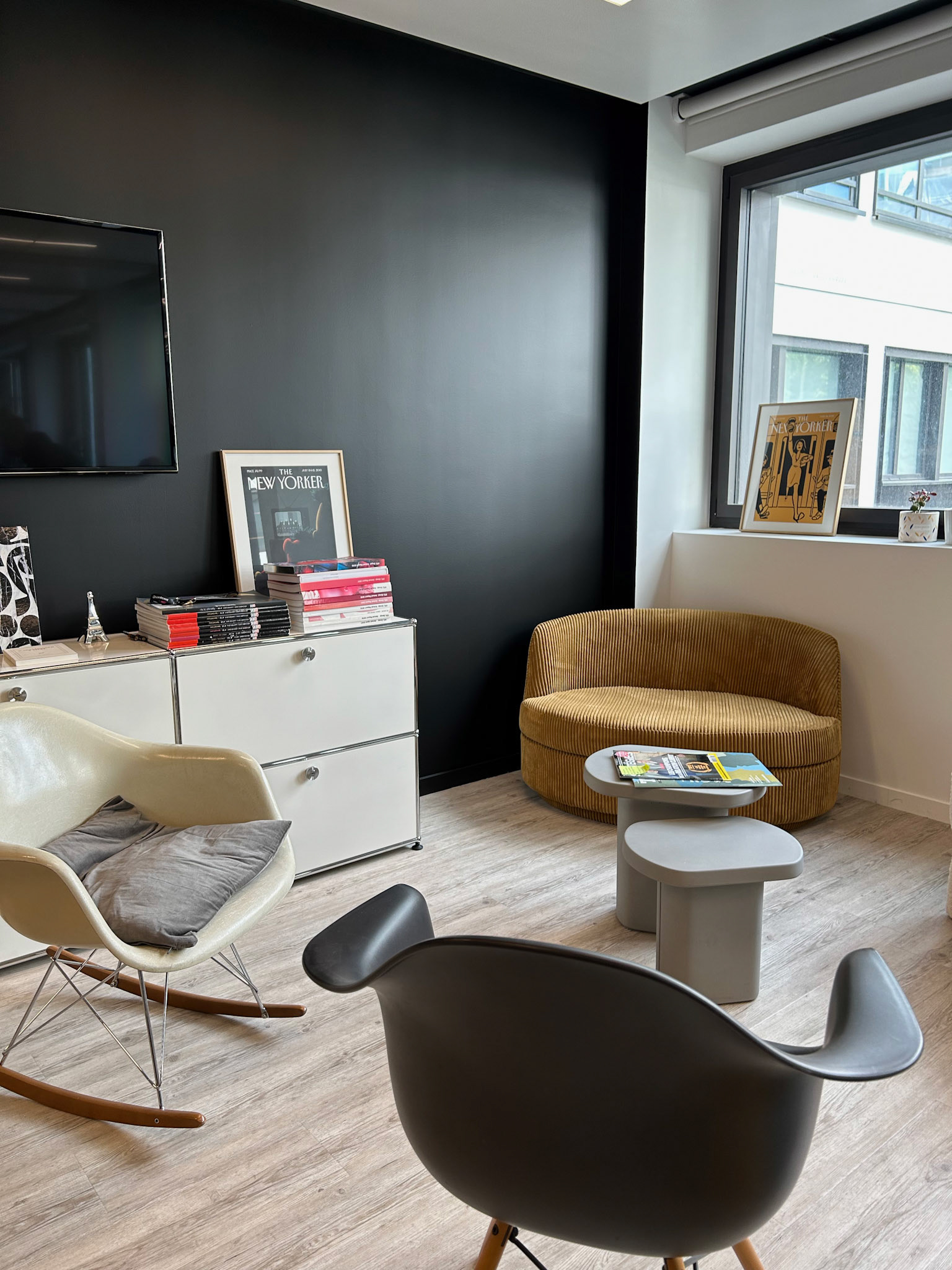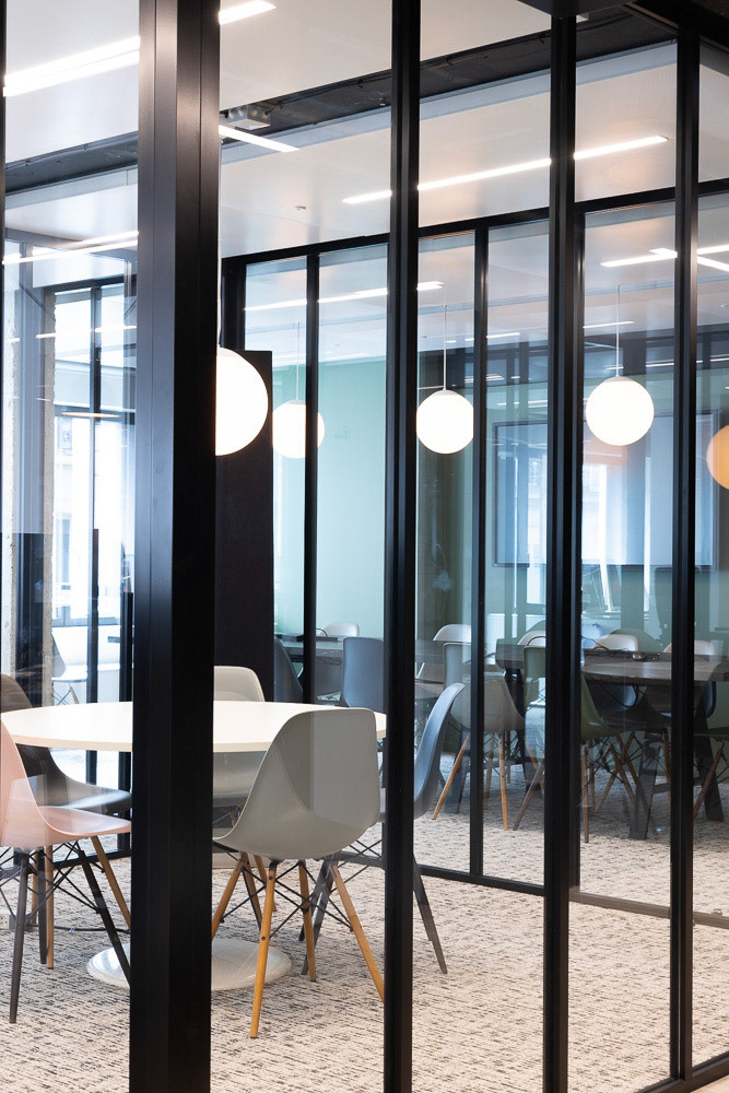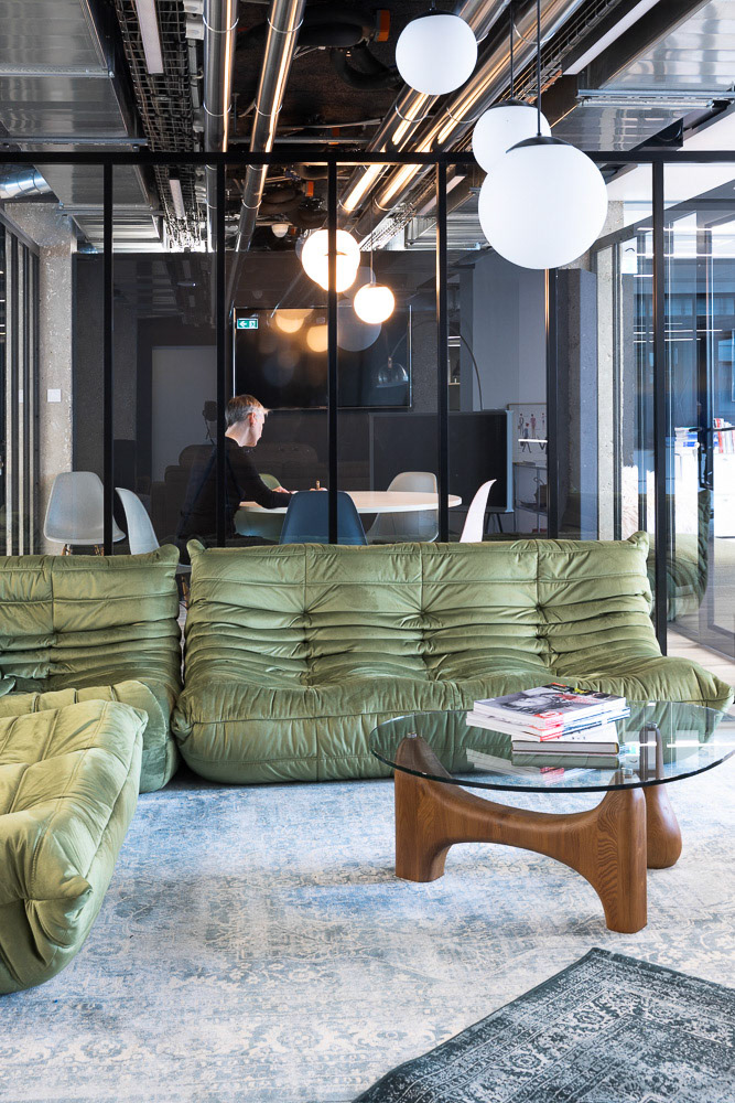 Plateforme de 700 m2 de bureaux en open space, salle de réunions fermées et phone box Y créer des atmosphères accueillantes pour des équipes jeunes , recevant des clients régulièrement de différents âges et nationalités . L' intemporel canapé Togo m'a paru très adapté à cette population aux goûts affirmés et intergénérationnelle. Tous les choix ont découlé de cette pièce maitresse. Le coin cuisine et les espaces de détente s'intègrent dans le lieu, rythmé par des verrières noires des salles de réunions . Les plafonds et les piliers en béton sont laissés volontairement bruts respectant l'âme industrielle du lieu.